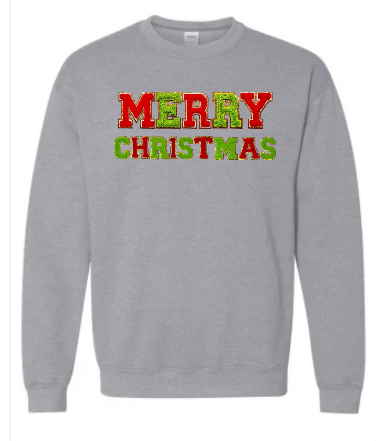 Chenille patches spelling out Merry Christmas on a crewneck sweatshirt. Adult sizing only. Available on red, black, gray, or green sweatshirt.