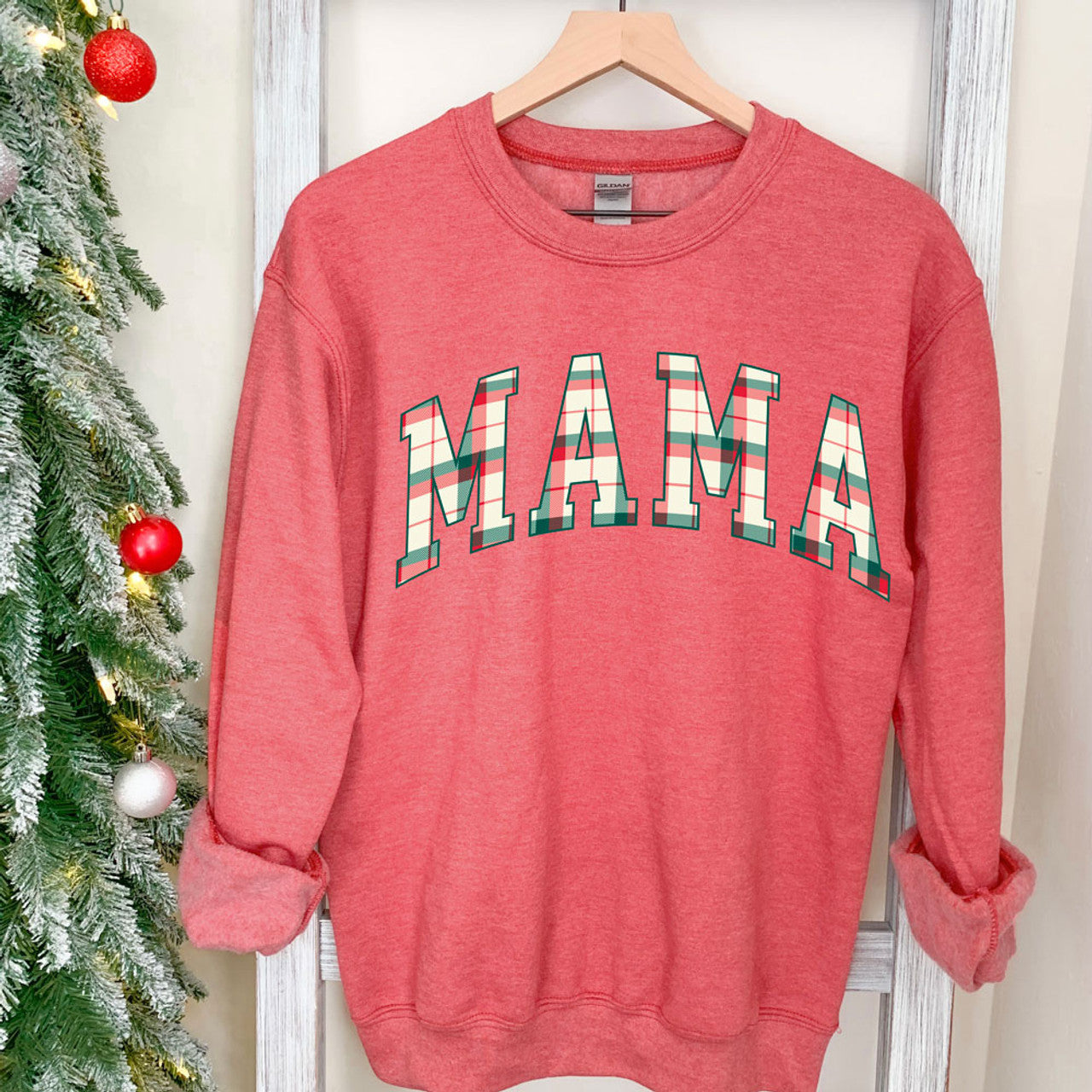 Plaid Mama design is on a red heather crewneck sweatshirt.