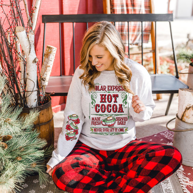 Design on the front and the sleeve of this ash colored crewneck sweatshirt.